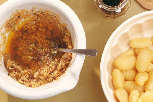 Nussgnocchi mit trueffel pesto sosse. Die butter in einem topf erhitzen das mehl mit einem schneebesen schnell einrhren. Mit restlichen walnusskernen und rauke bestreuen. Auf eine vorgewrmte platte geben.